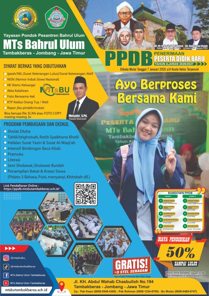 Dengan penuh rasa syukur, saya ucapkan selamat datang di website resmi MTs Bahrul Ulum Tambakberas.